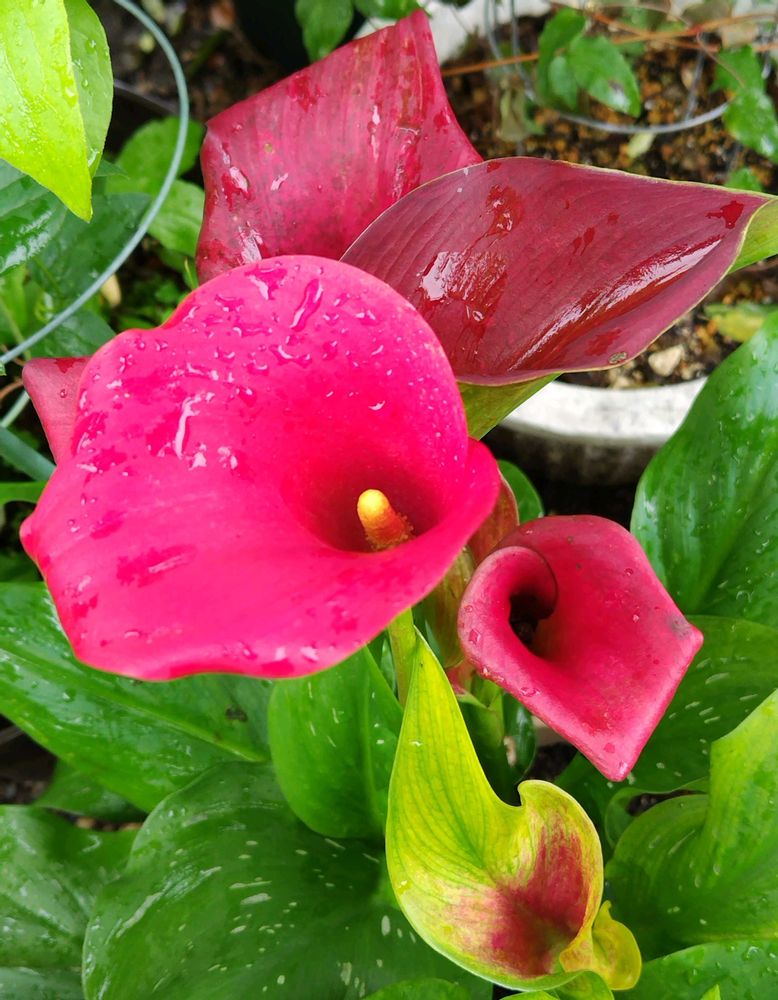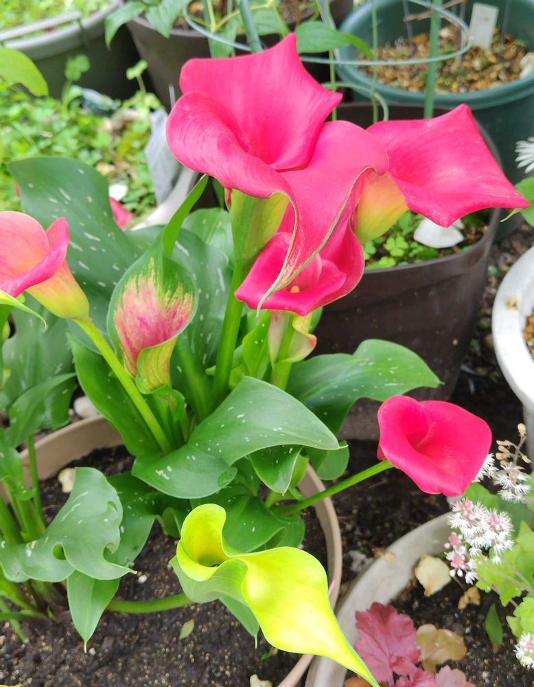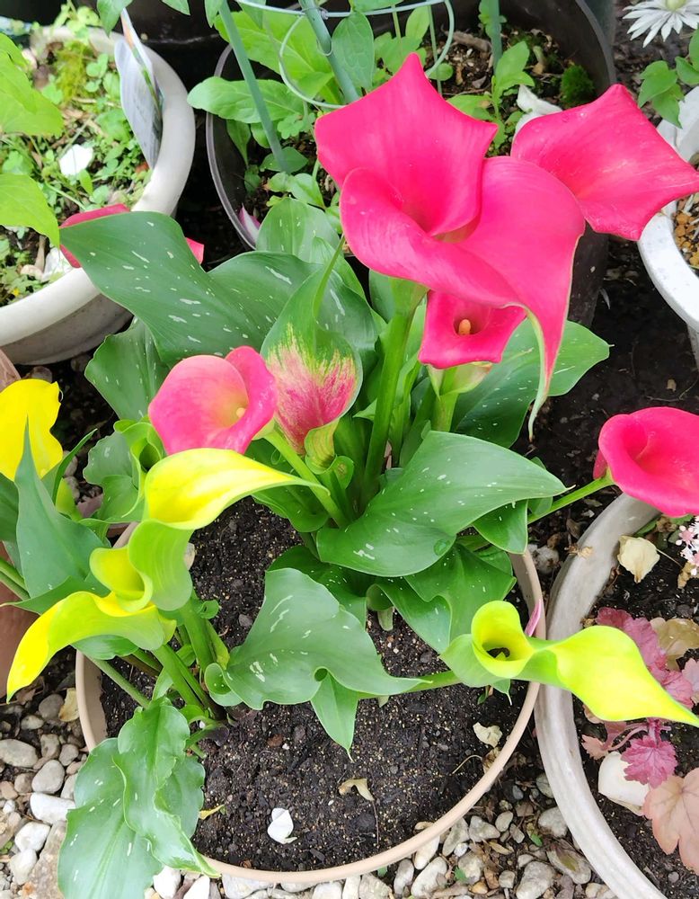 ①②③5月にお迎えして2色の寄せ植えにしたカラー💚💗💛💚