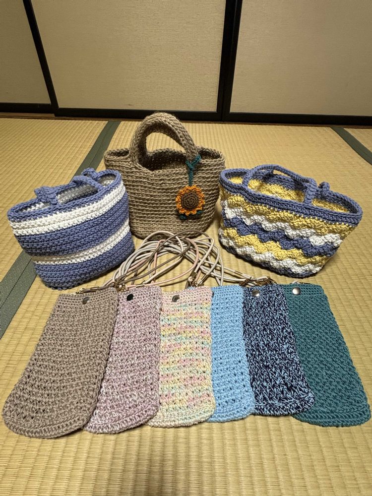 真ん中のバッグは麻紐、他のはコットン糸、スマホポーチはレース糸で編んだとか。帰宅後LINEで連絡を取り合って、お嫁さんと長女の3人で分けました。