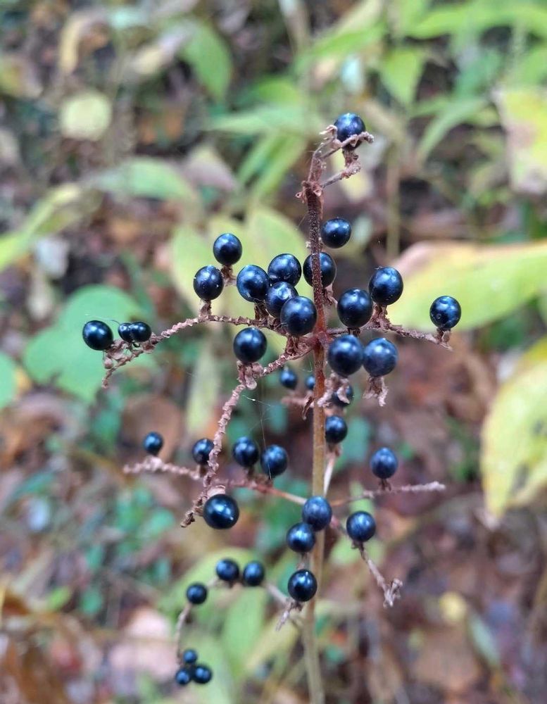 ツユクサ科ヤブミョウガ属の多年草。林内など湿り気の多い日陰に生える。茎や葉はざらつく。花期は8~9月。茎の先に白い花が輪生状に数段つき、両性花と雄花がまじってつく。花は開くとその日のうちにしぼむ一日花。果実は球形の液果。秋に藍紫色に熟す。表面に光沢があり、乾いても裂けないため長い間残る。種子は灰色で砂粒ほどの大きさ。