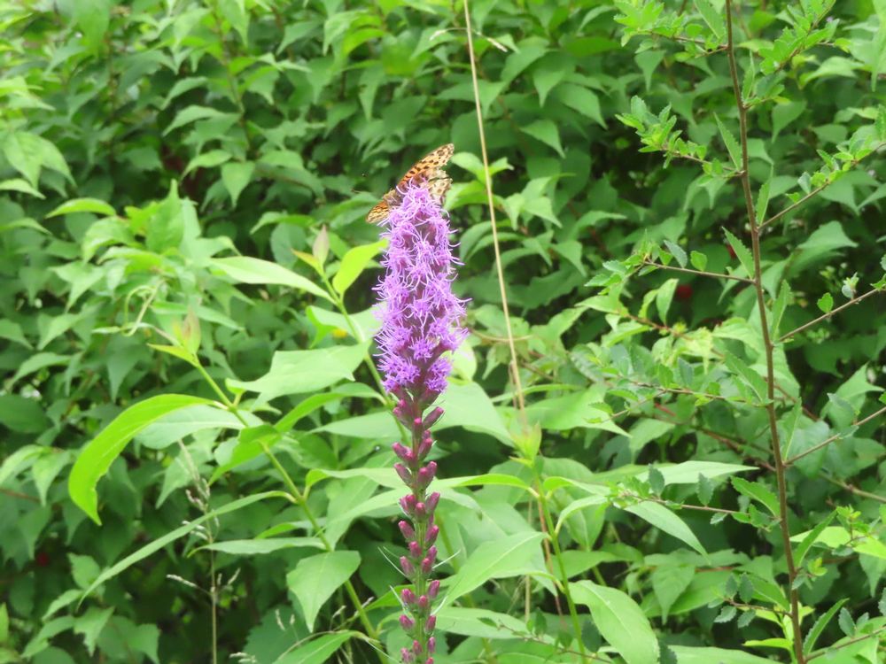 昼時の「リアトリス」、蝶(ヒョウモンチョウ)もお昼時だったようです。パチリ