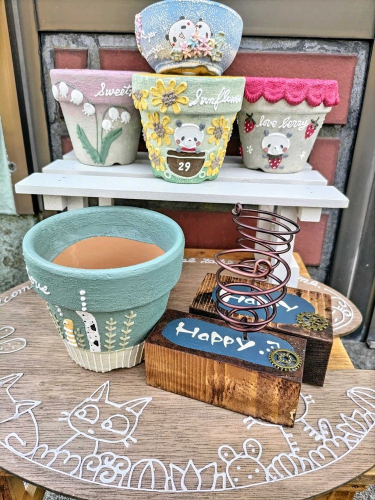 ①昨日、レオのママさんと一緒に出掛けた夜越山サボテン公園、白峯園さんの多肉まつりでGETしたあさみさんのリメ鉢3個と上のさやさんのパンダのリメ鉢、下はここばな庵さんのボード、リメ鉢、エアプランツ入れです😊
