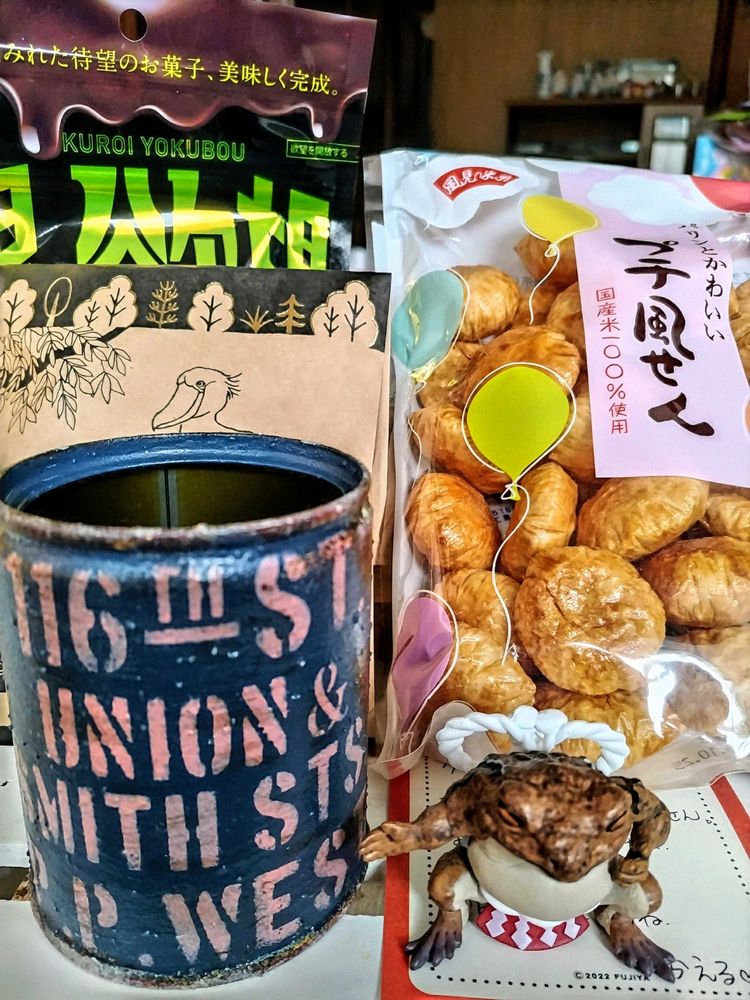 手作りのリメ缶、ハシビロコーヒー、お菓子、おせんべい、かえるのガチャ…かえるさん、ありがとうございまし(*ᴗ͈ˬᴗ͈)ꕤ*.゚