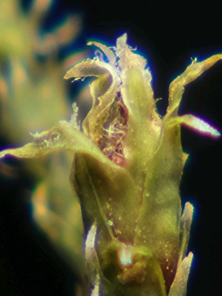 雌苞葉は大きく、葉先近くに白く長い毛 が多く有ります。蒴は苞葉に包まれ見え 難いです。