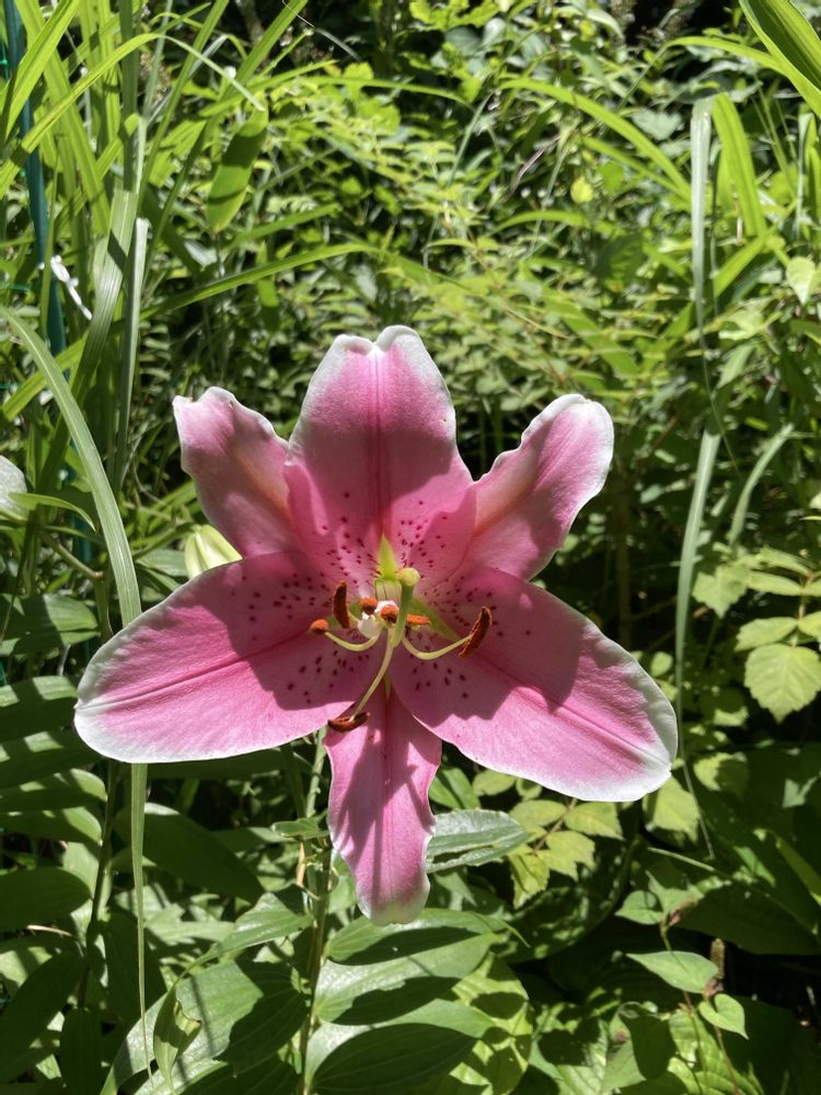 庭を見ると、見た事の無い桃色の百合が咲いてました。花径は17㌢です。調べるとオリエンタルハイブリッドと言う交雑種の様です。更に調べるとスターゲイザーと言う品種に似てる気がします。去年はヤマユリしか咲きませんでしたが、こんな色の百合が咲くんですね。