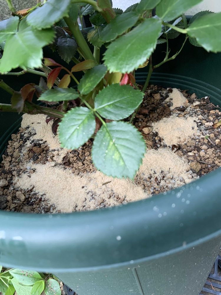 挿し木ポットを除くすべての鉢バラに米ぬかをまいて