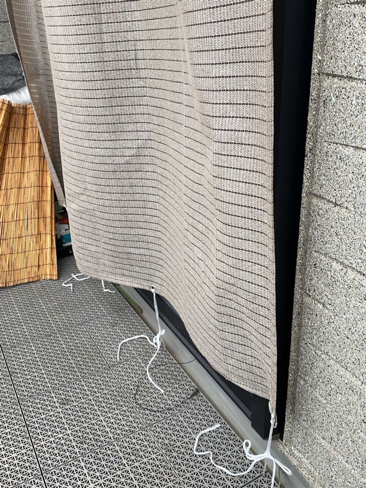 2枚目サンシェードを掛けたのですがあおられてはとベランダのスノコにくくりつけました(3枚目)