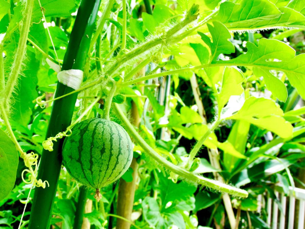 小ぶりのスイカ🍉現在 直径5cm(名札を無くし 詳細不明) 昨年は 冬瓜を植え 狭い庭を 暴れまくったので 今年は 小ぶりのスイカに しました。初めてのスイカ🍉成長が楽しみです😊