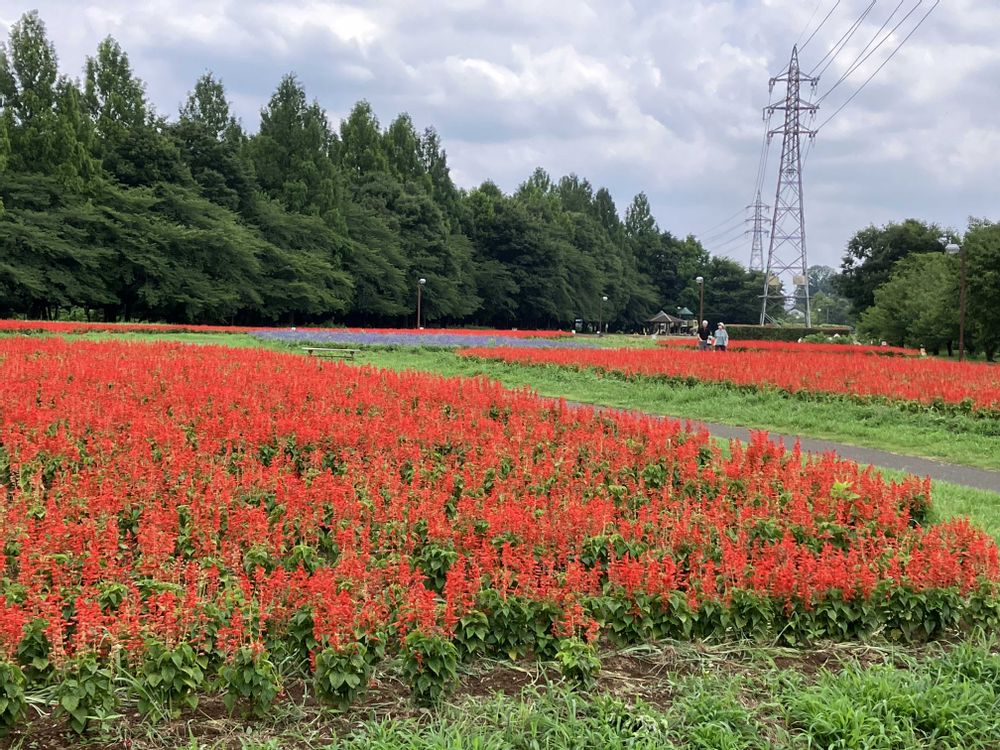武蔵野の平地林に囲まれたお花ばたけ 今は赤、青のサルビア 未だ小さいコキア目を楽しませてくれます
