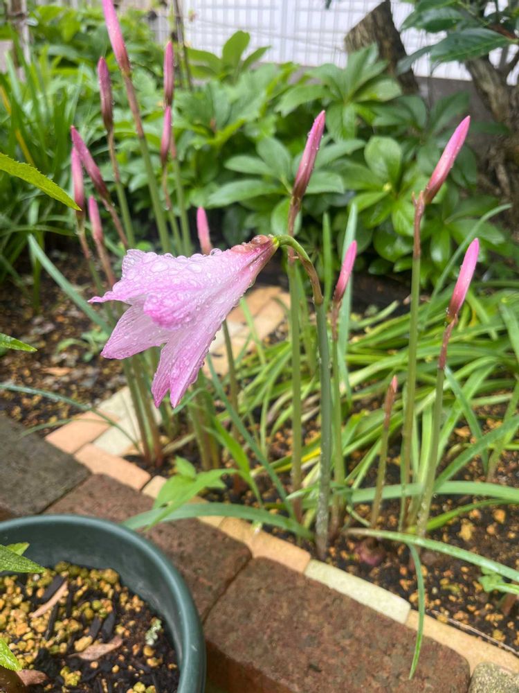 ゼフィランサスもしくはハブランサス?いわゆるレインリリーと呼ばれるものかな。白花ならタマスダレと品種名で呼ばれることもあるよね。