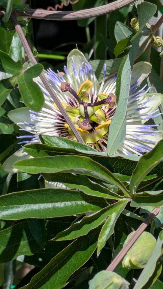 3️⃣鉢植えの支柱のトケイソウは1輪咲き😆のびのび咲いていても暑そう🥵💦