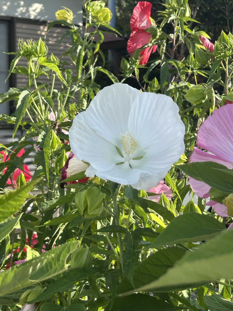 畑の入り口の花壇で、①白いタイタンビカスのエルフも咲き始めました。これで色の異なる4種類のタイタンビカスが全部咲きました。②これも緑の推進団体から頂いた白いゆり、カサブランカも咲き始めました。③さらにオレンジ色の鹿の子百合も咲いています。