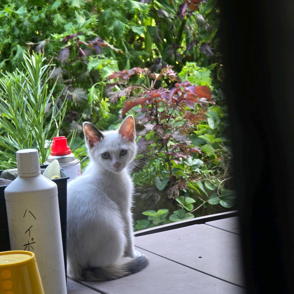 子猫かと思って振り返ると…そこにはクリっとした子猫よりも大きな目と白と灰色の様なもふもふした毛並みの😱😱😱
