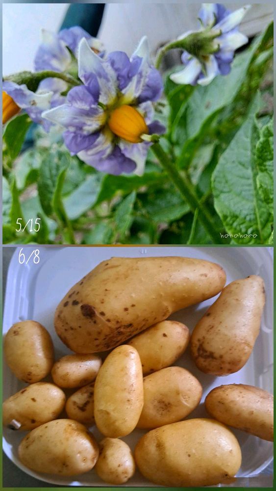 ジャガイモはビックリです。花が咲いてたので、もしやと思って花が枯れていたので掘って見たら出来ていました。(^o^)v