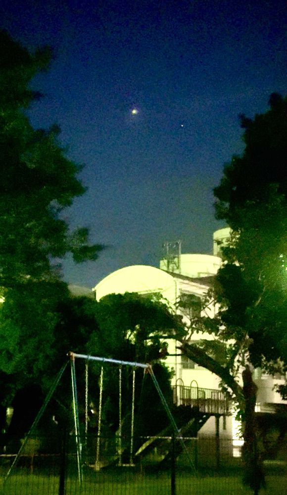 📝9月15日早朝🕟4時半過ぎ、直ぐ近く約50m付近にある小さな公園の一角に聳え立つ大きな🌲楠木と楠木🌲の間から、北東の天高くに観られる✨明けの明星;金星:Venusを写したものデス🐶