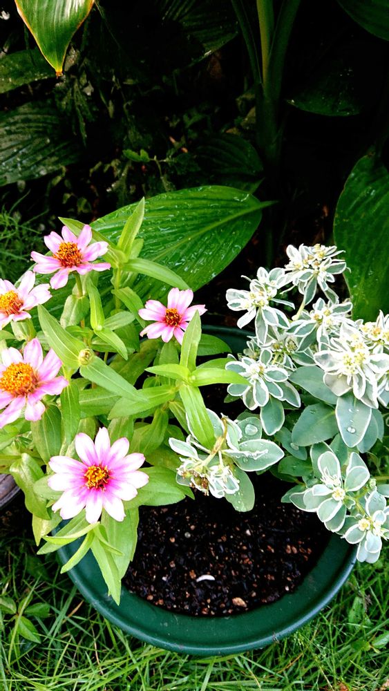 このジニア好きですが、こぼれ種からは黄色しか出なかったので、以前から欲しかった初雪草と寄せ植えで🤭‼️