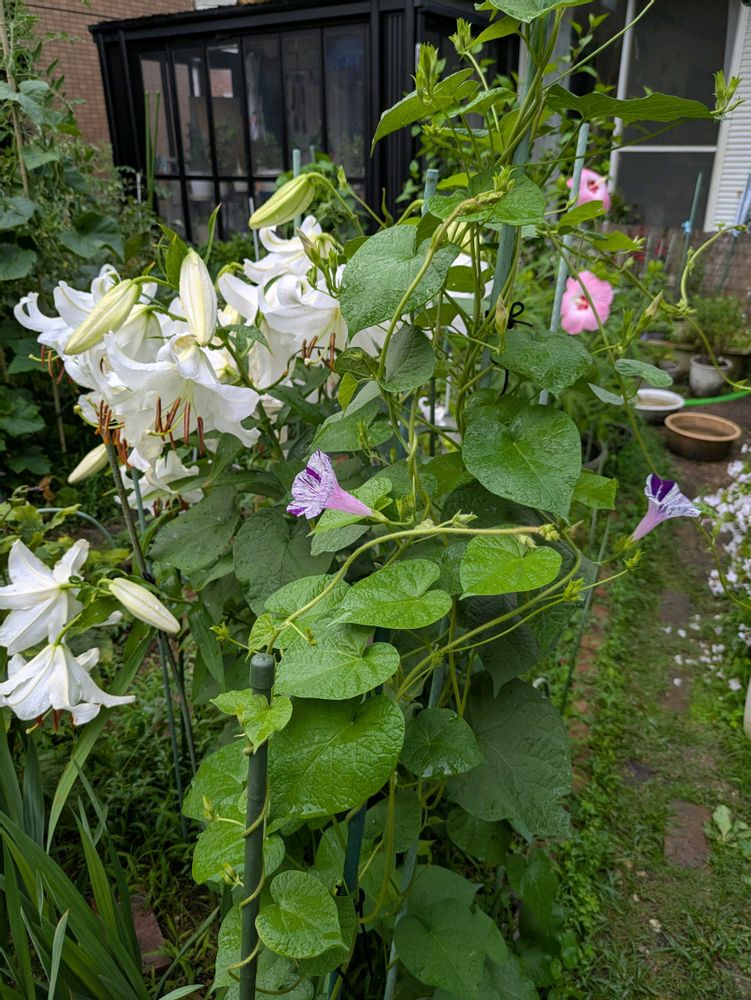 アサガオ 江戸風情 カサブランカの隣からこぼれ種で生えてきました。一つの小さな種から、物凄く育ちます。紫の入り方も様々です。