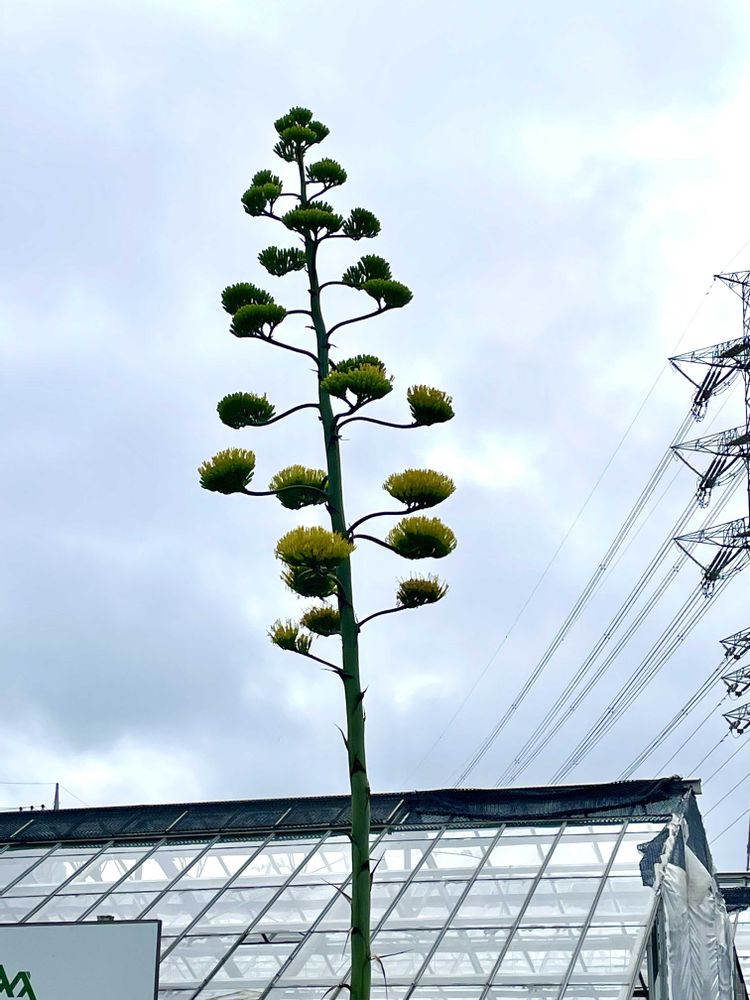 市内に咲いている初めて見たリュゼツラン!8m程に成長😵している様で黄色い花を咲かせています。テキーラの原料にも使われる様です😆