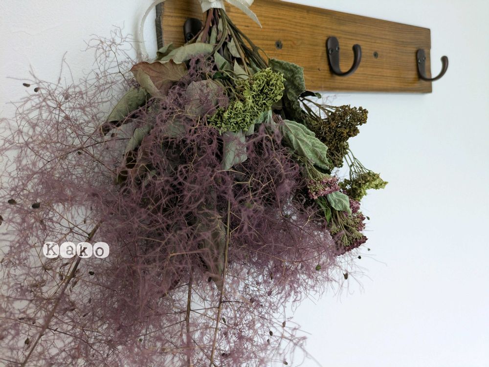 アナベルとスモークツリーのドライフラワーを束ねて飾りました