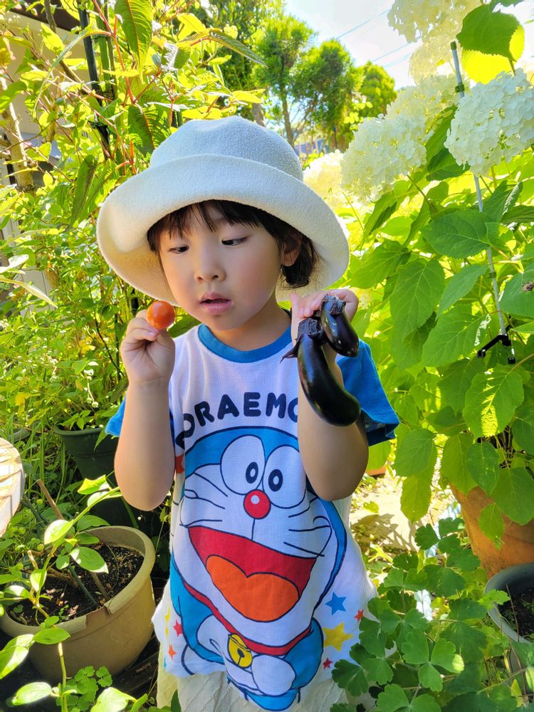 そして先日お誕生日祝いに我が家にやってきたまごちゃん次の日に4歳になりました🎉家にたまたまあったドラちゃんにお着替えして私の帽子をかぶりなが靴で小さなお庭へ……初の収穫🍆🍅市販の野菜を見てるので霧中になって探してました😍小さくてもとっていいよーと言ってしまう(笑)