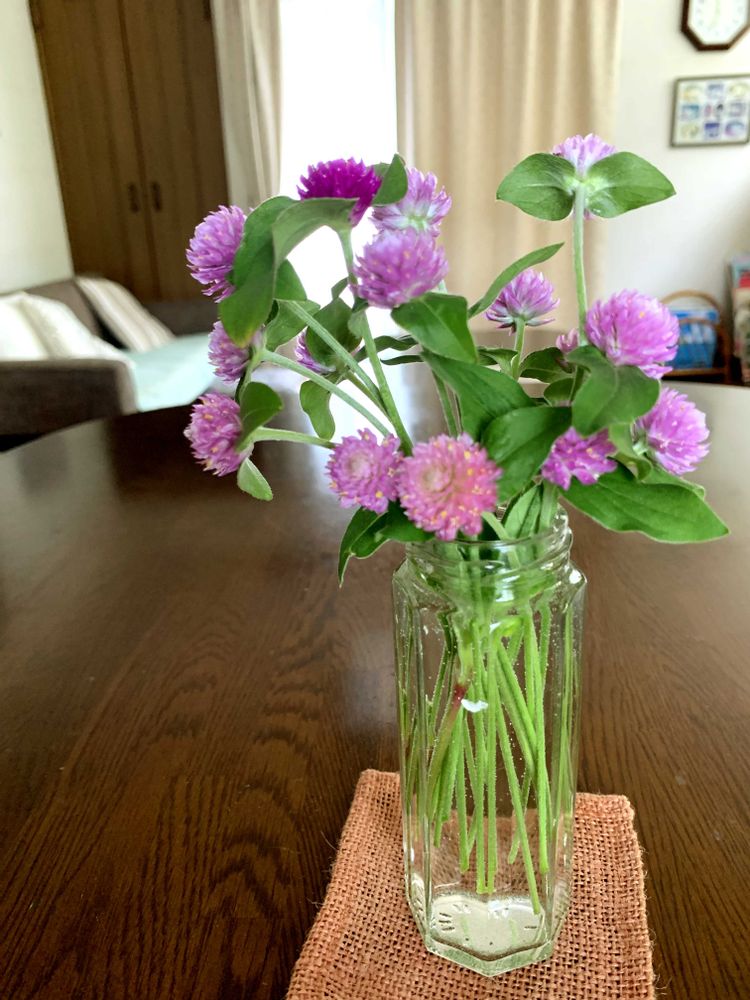 新しく✂️してきた千日紅、ブルーベリーソースが入っていた瓶にピッタリ🫙 ガラス越しに見える茎部分も素敵💓