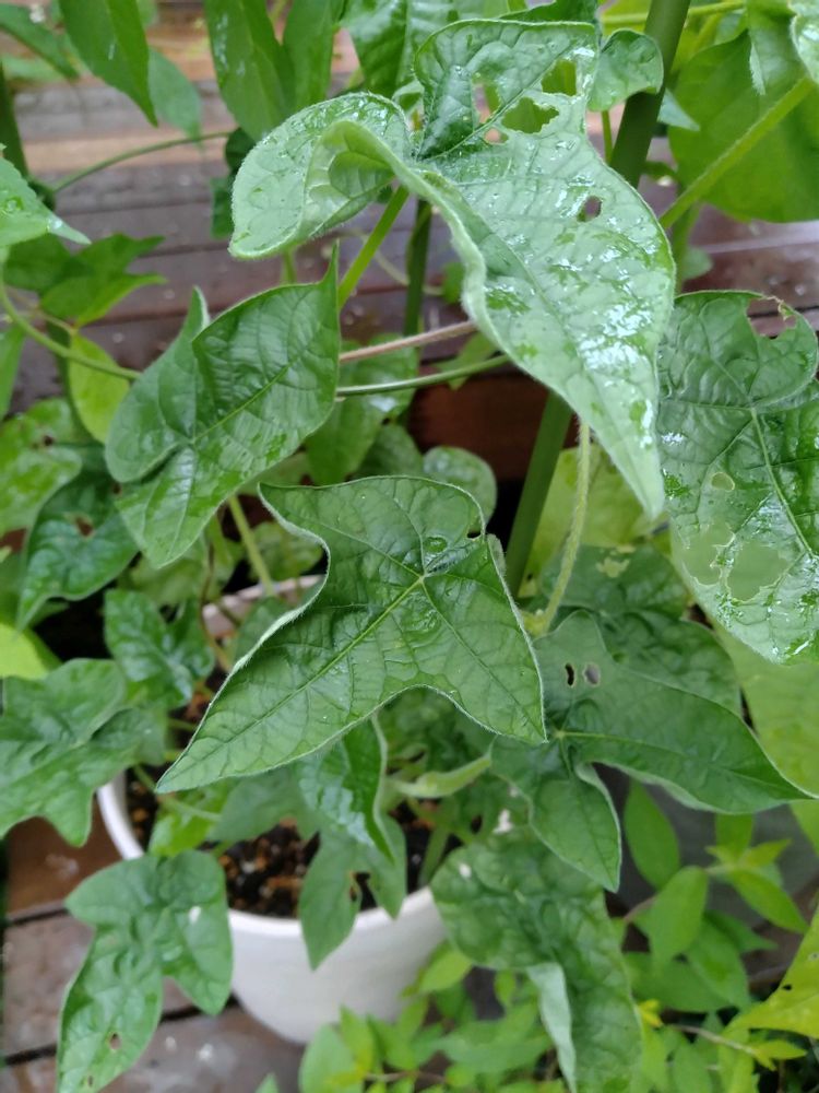 4)桔梗咲きの朝顔は葉っぱも変わってます。