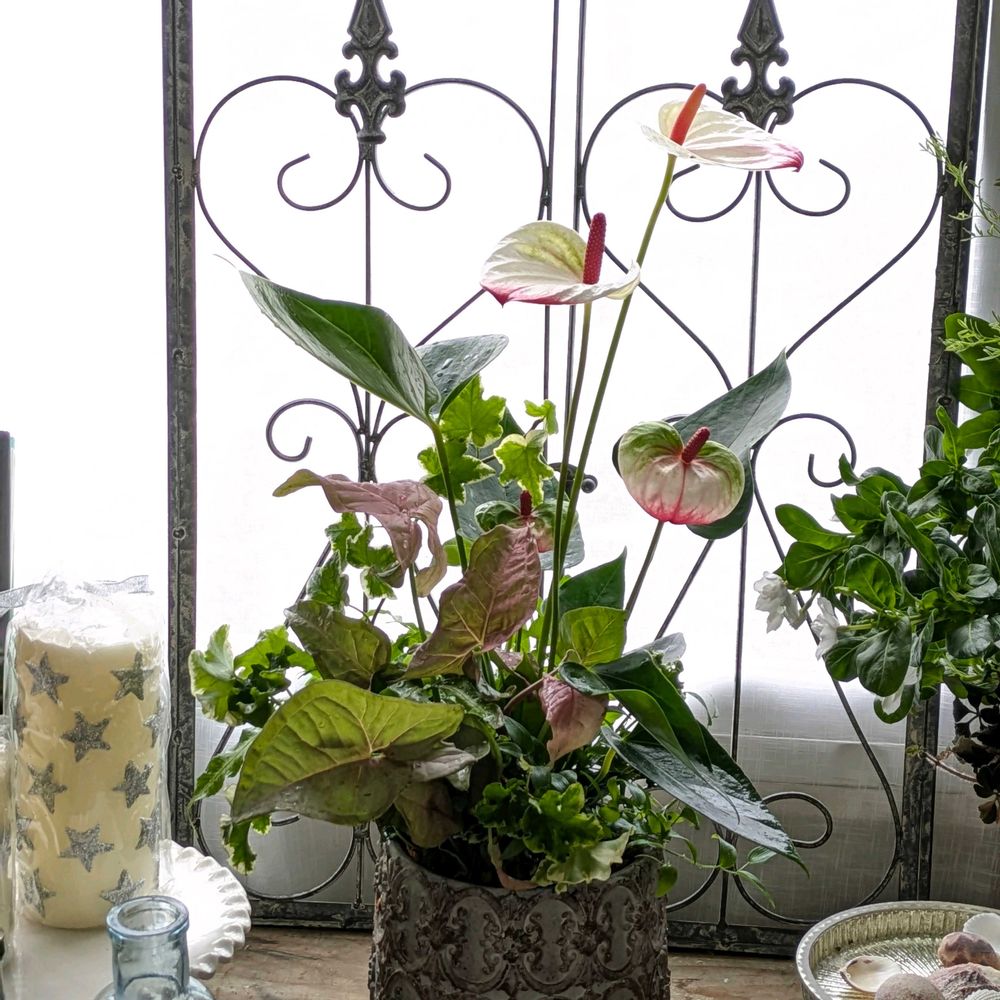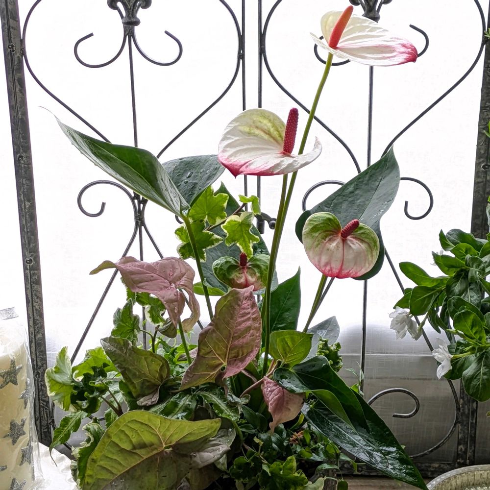アンスリウムの色が素敵でシンゴニウムのピンクと、とても良く合っています😊
