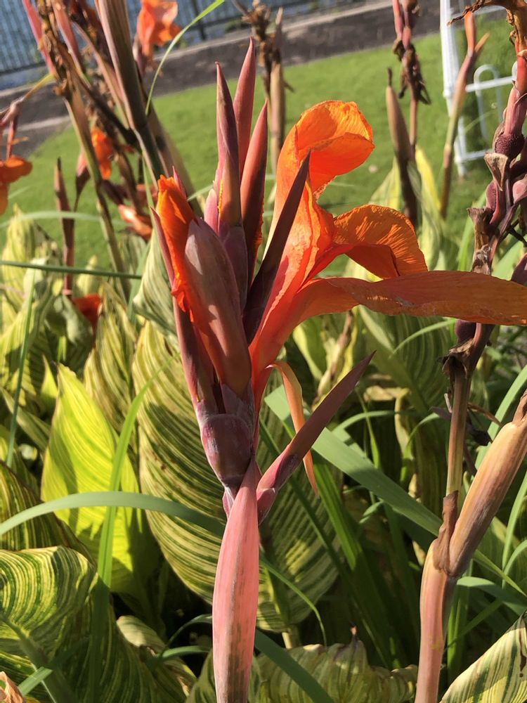 夕暮れ時、道路沿いの花壇にて、オレンジ色の「カンナ」と「ヒメヒオウギズイセン」をパチリ!📸🧡🌿😊😄🌇👌
