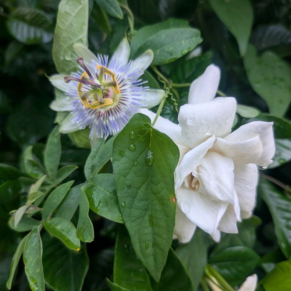 トケイソウとクチナシの花が仲良く咲いていました☺
