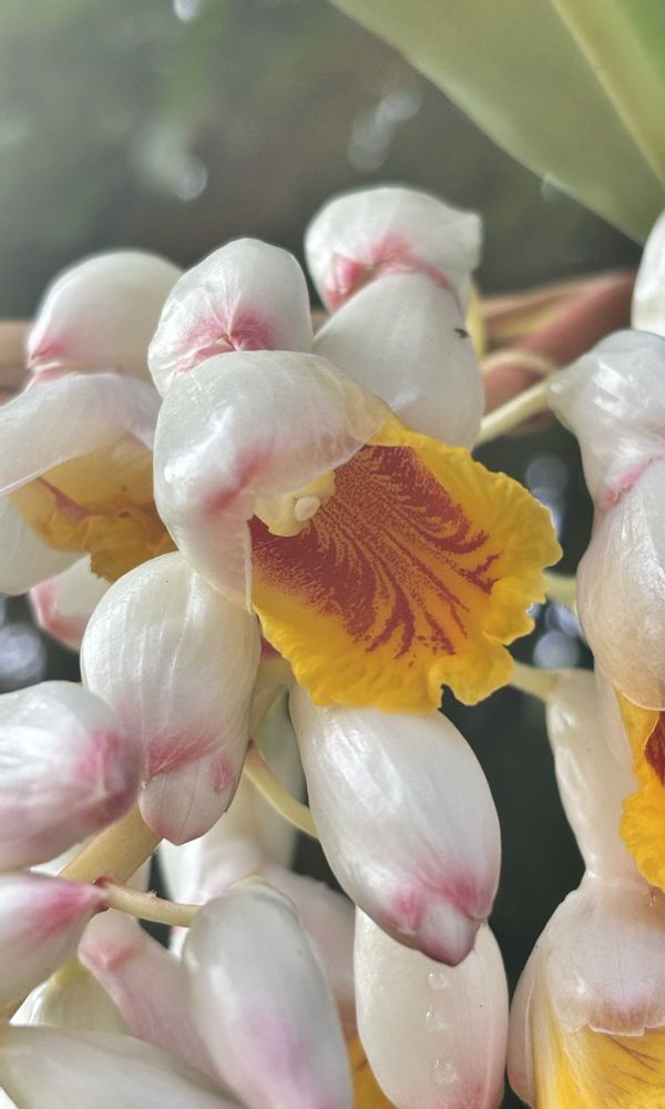 偽茎の先端から穂状花序を出し、やや垂れ下がり、赤い縁取りの入った白い苞に包まれた蕾が並び、その先が開くとそこから突き出すように大きな白い花を咲かせる。