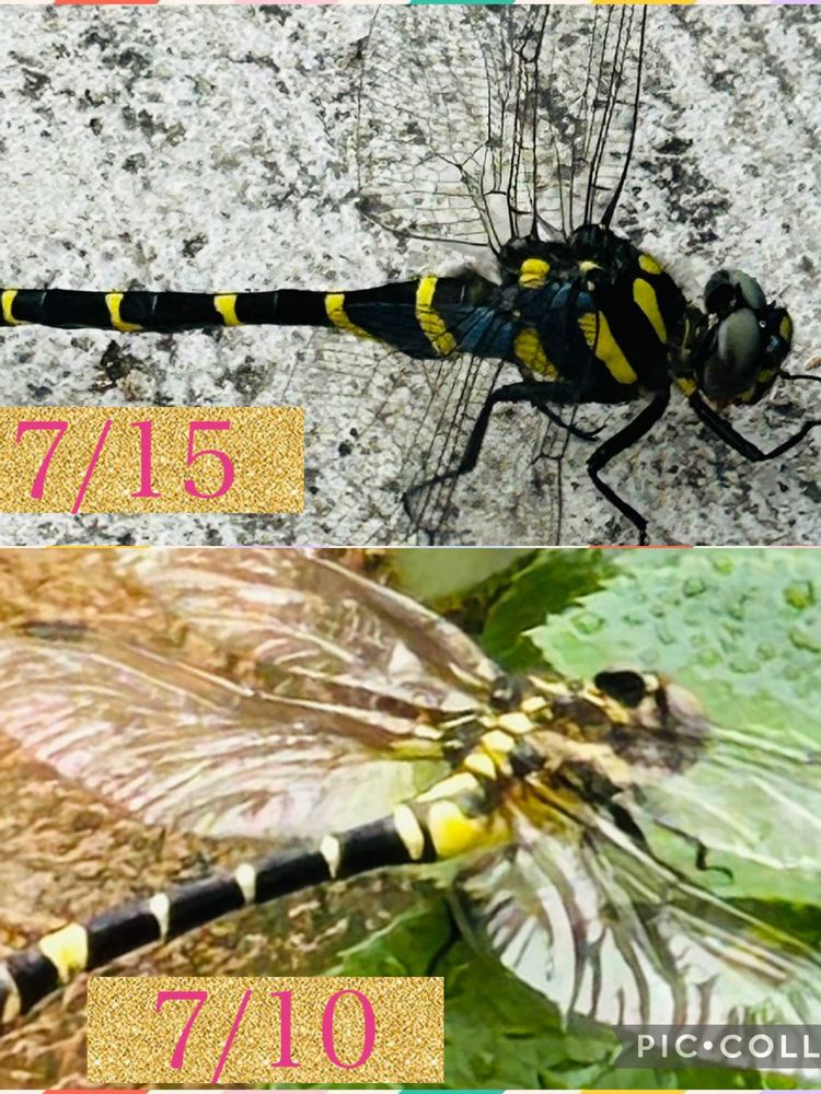 先日見つけたオニヤンマに似た子とは明らかに模様が違うので今日見た子はオニヤンマ確定😊でもなんか小さいなぁ〜気候のせいかしら☹️