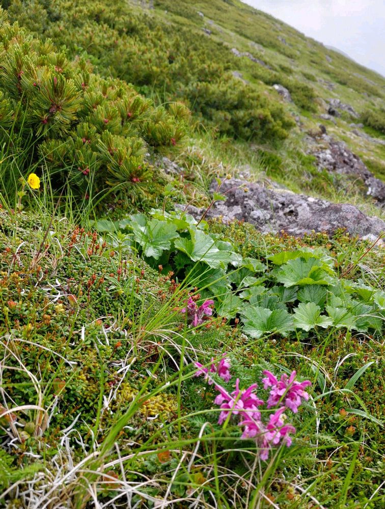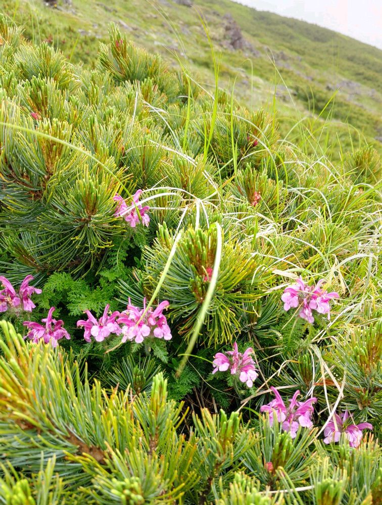 ハイマツの中から顔を見せるミヤマシオガマ💕🌿
