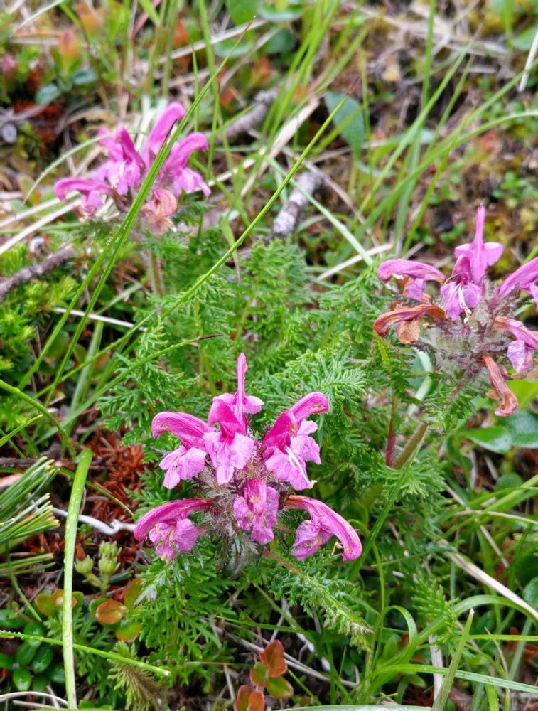 ミヤマシオガマ…ヨツバシオガマと比べると、葉に細く切れ込みが入りフサフサで、お花は上唇が大きく上に飛び出しているように見え、纏まって咲く姿が華やかでした。