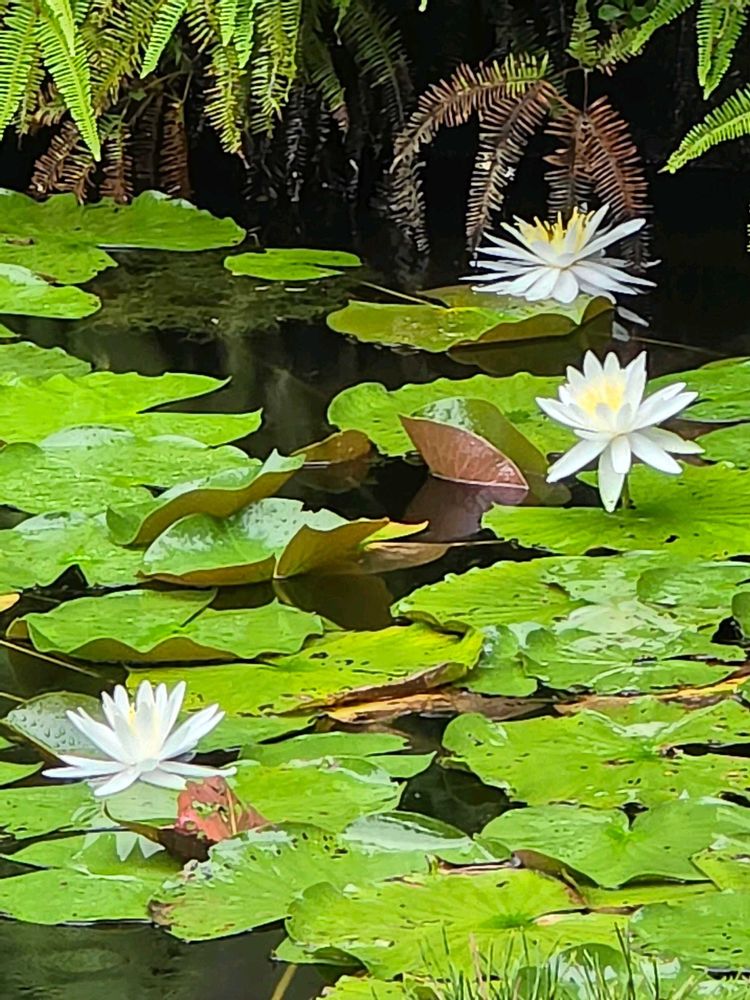 緑の蓮の葉やシダの中に浮かぶ白い睡蓮は涼やかでした✴️