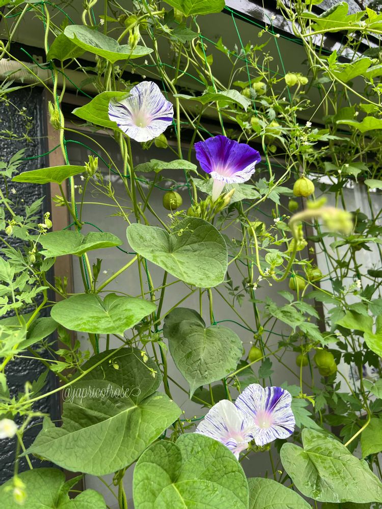 グリーンカーテンに江戸絞りの花とフウセンカズラの実が一面に広がっています✨