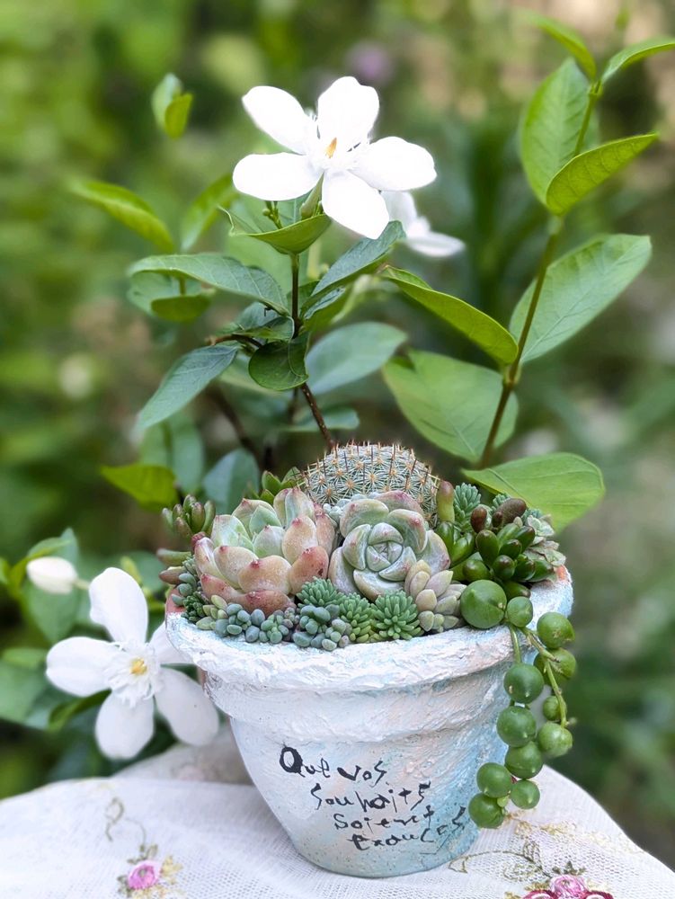 寄せ植え、後ろにひょこって顔覗かせてるサボさんがめちゃかわいくて癒される〜😊