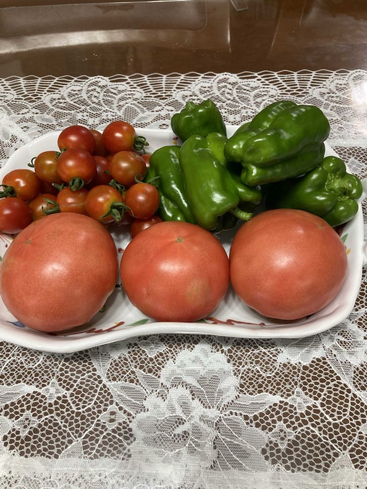 朝から、収穫した、ミニトマト、桃太郎、ピーマンです。😍