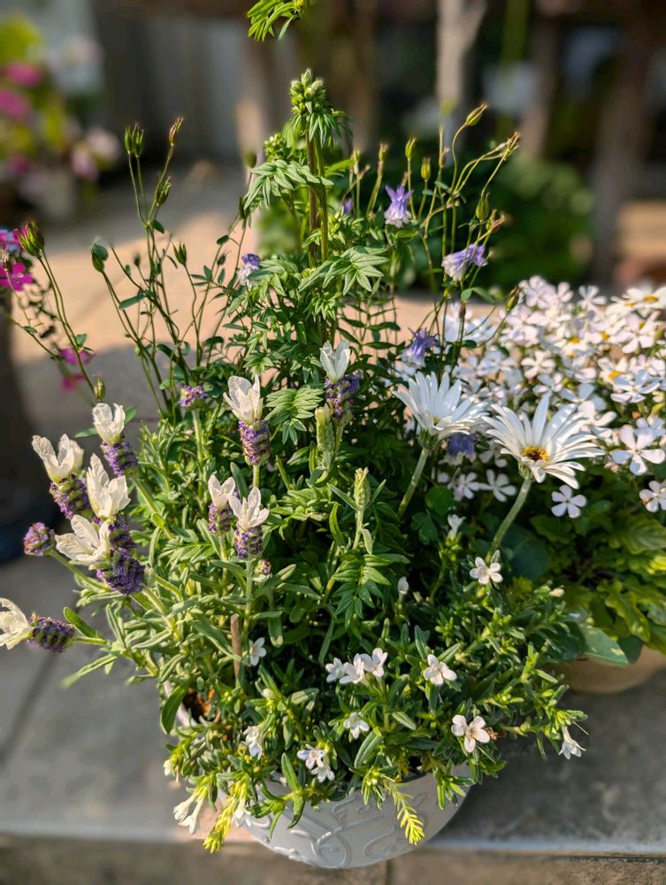 ①5月の寄せ植え白ラベンダー②妹の玄関前のラベンダー③ラベンダー④アガパンサス⑤ヤマユリ