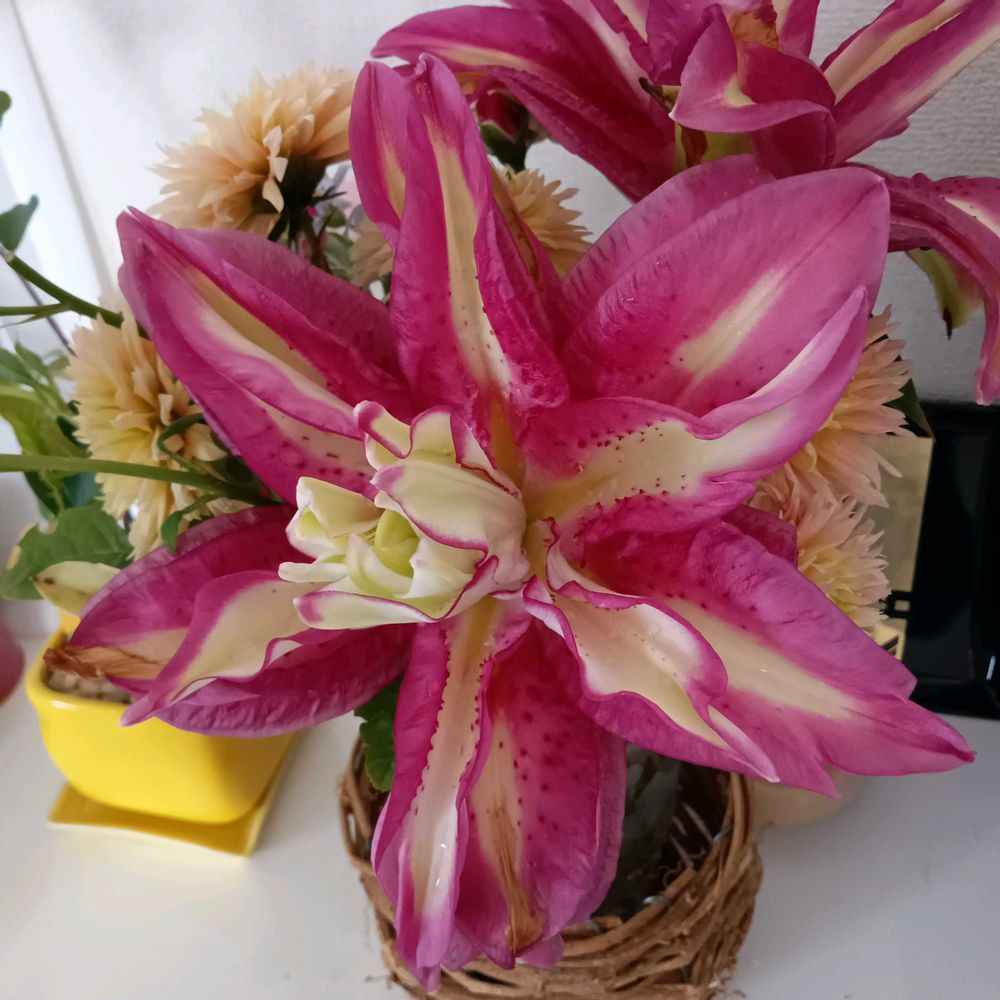 5️⃣八重咲ユリピンクは2本あるので1本✂️して飾りました。雨が降ったり止んだりの天気☔