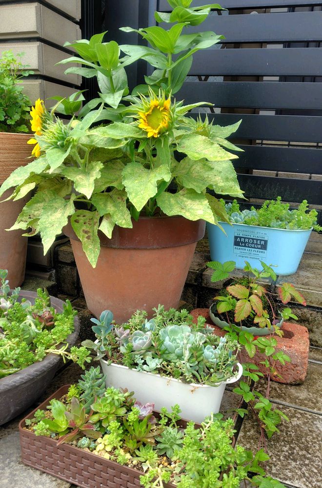 ①玄関先の🌻。ジニアと寄せ植えにしたんだけど、詰めすぎて失敗💦。