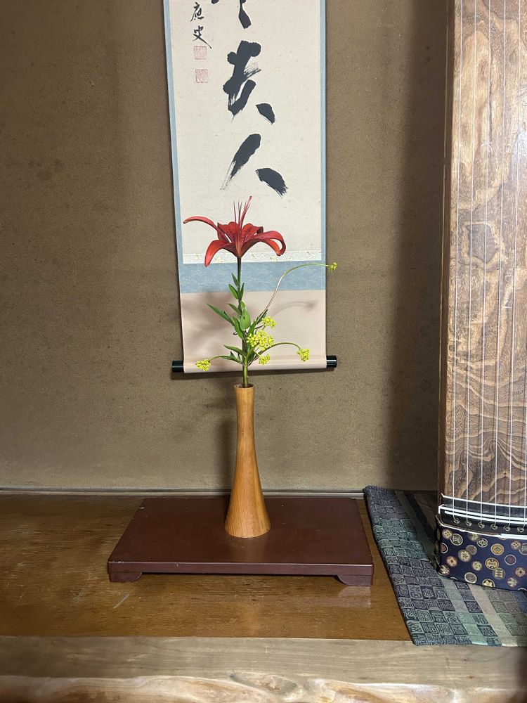2、美しい百合を見ていただきましょう。1本でこの存在感❗️1輪でいいのですが、木製の一輪挿しも地味なので、女郎花を足元に添えます