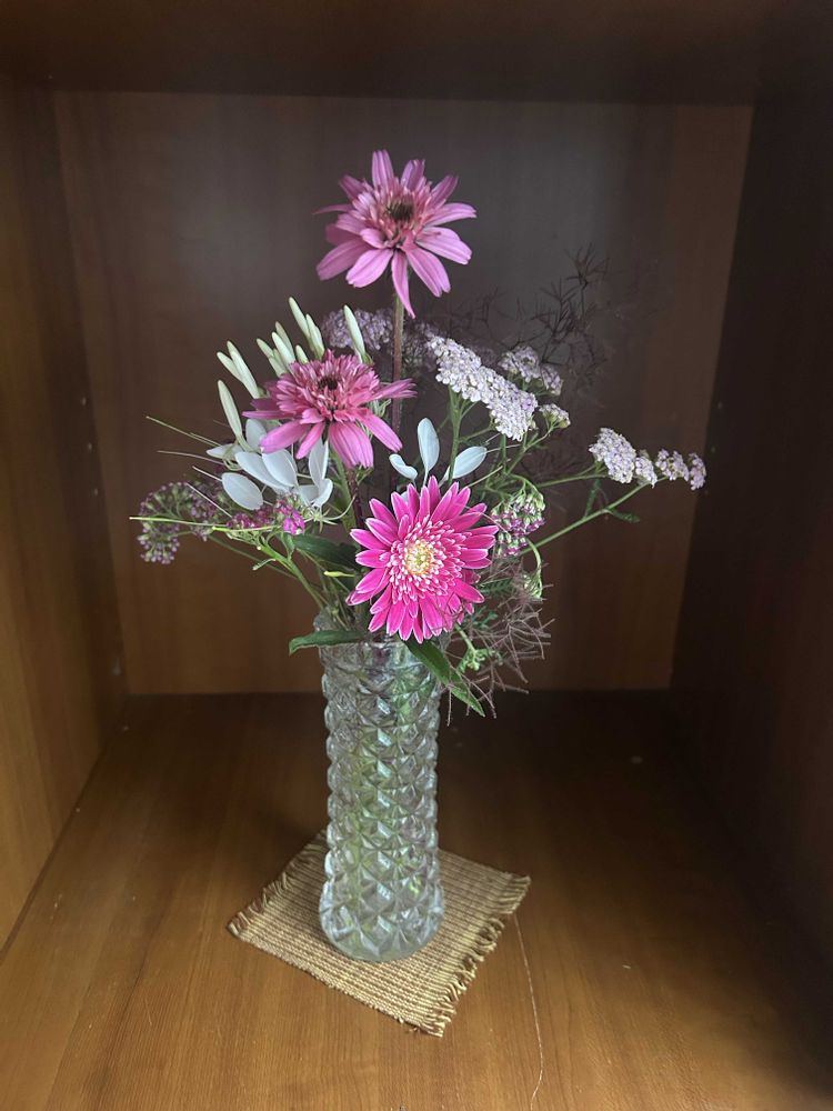 3、玄関にはガラスの花瓶で。季節のお花たちのアラカルトです