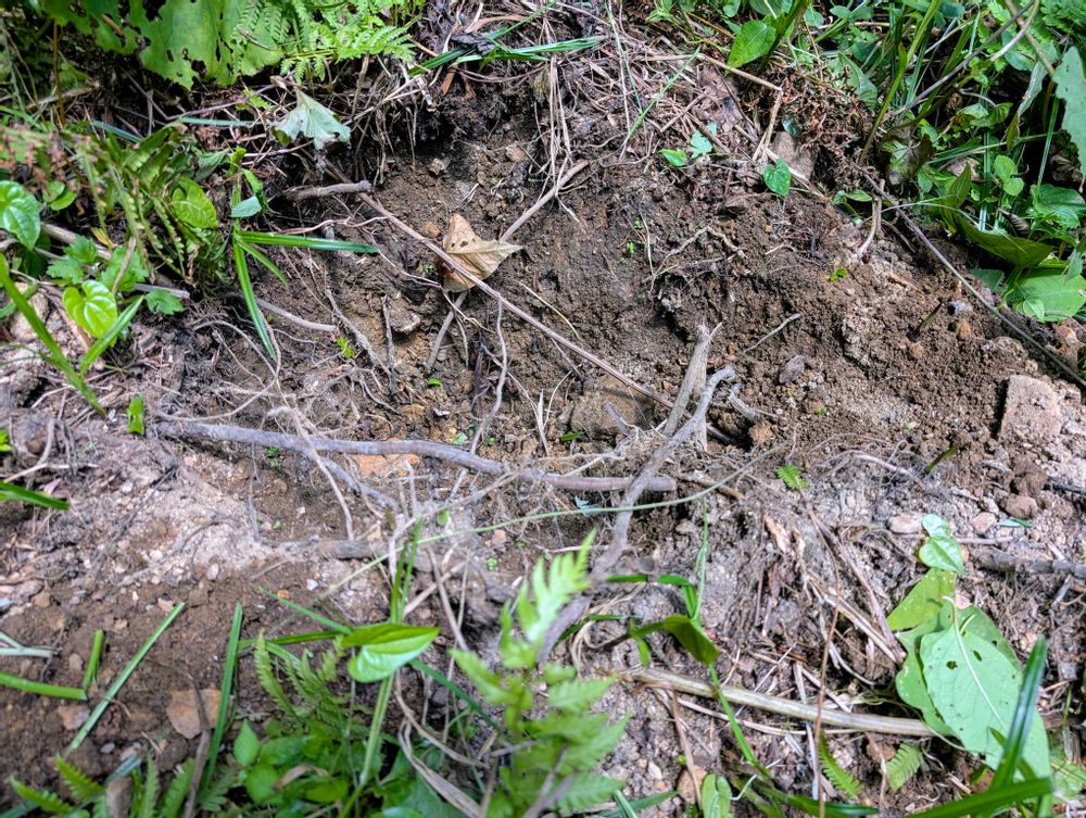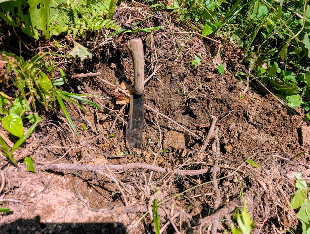 こんにちは😉午前中に池に水を引いている沢のタンクのメンテナンスする道の草刈りをしました。途中2カ所に大きな穴がありました😅2枚目の画像にナタを立てました、ナタの長さは37センチですがわかりにくいかも🤔イノシシが掘り起こしたのは好物のヤマイモです。