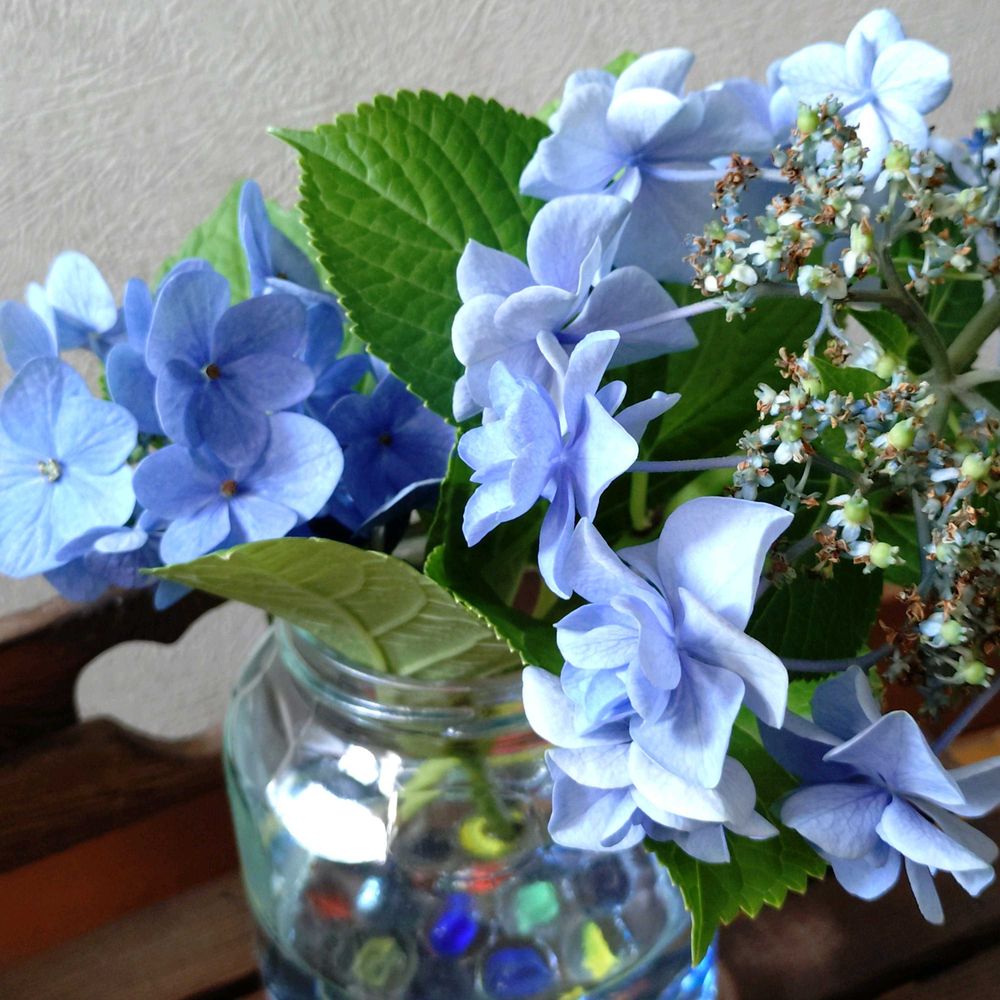 家の中で飾られてるアジサイ2種 1種は中心部分はポロポロと落ち始めてますが水替え時にお花を洗い流すようにしてからまた飾っています