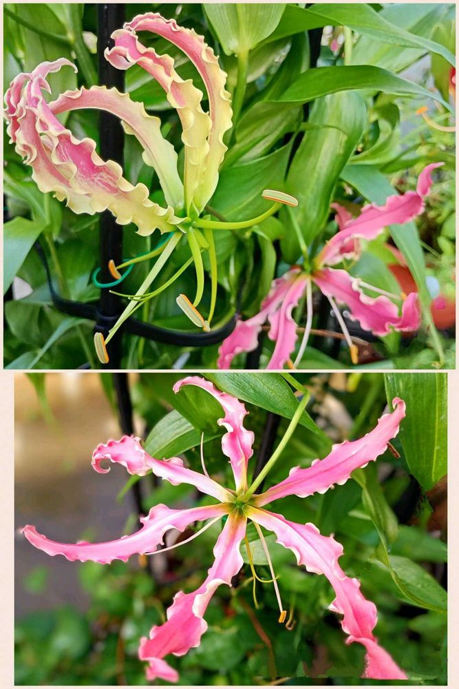 ✤グロリオサ🩷…やはり、昨年咲かなかった球根。ピンク花。これから花弁を反り上げ グロリオサらしい花形に。⬆️もピンク🩷花色のようです。