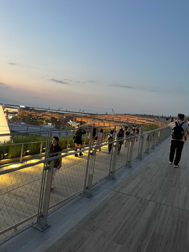 陽が落ちてから、万博会場のルーフに登りお散歩しました。海も見えて