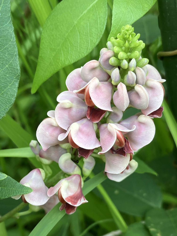 アメリカホド (イモはアピオスと呼ばれる)北米原産のツル性マメ科植物 花は葉腋からのびる柄に房状に10〜40個ほど咲く 地下茎が肥大してイモ状になったものを食せる