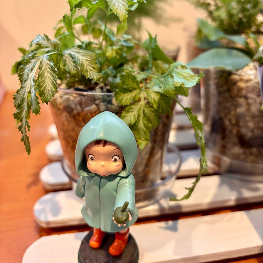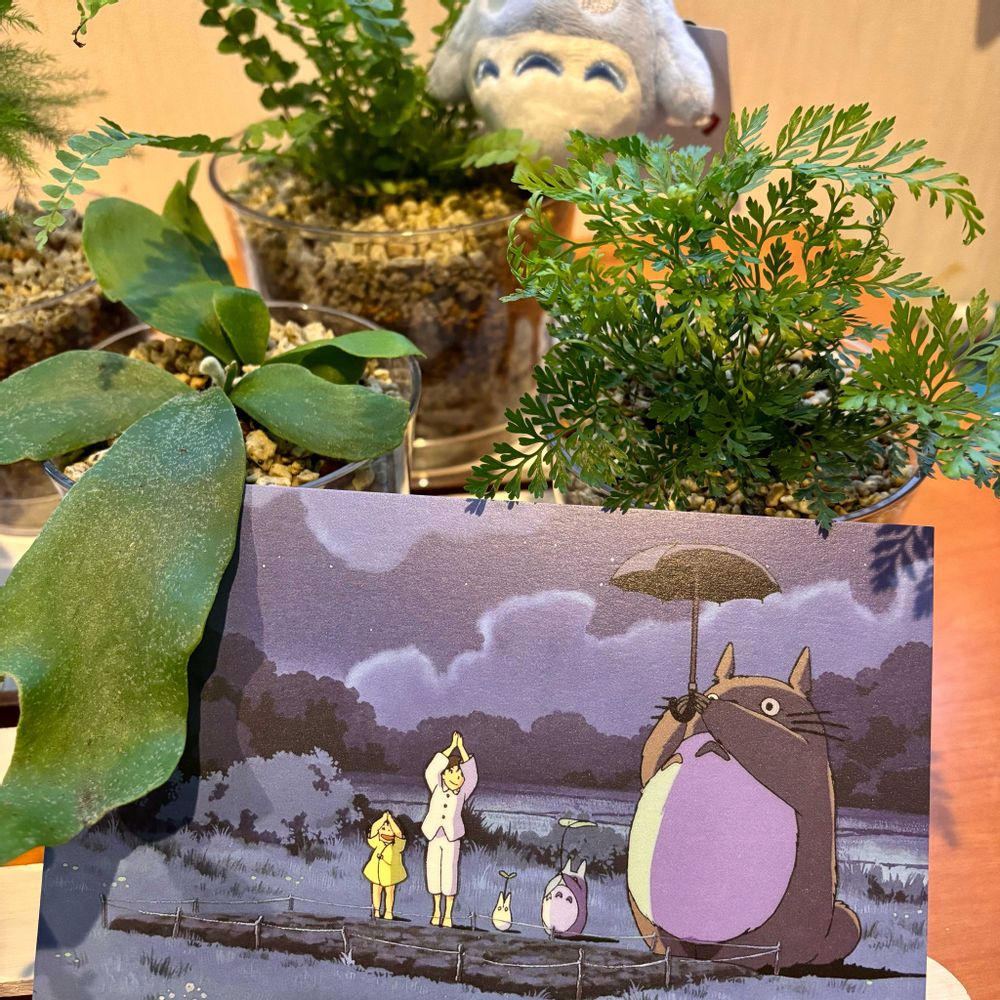 ジブリパークで買ったポストカード、メイちゃんのフィギュア、小トトロのぬいぐるみで参加します💕