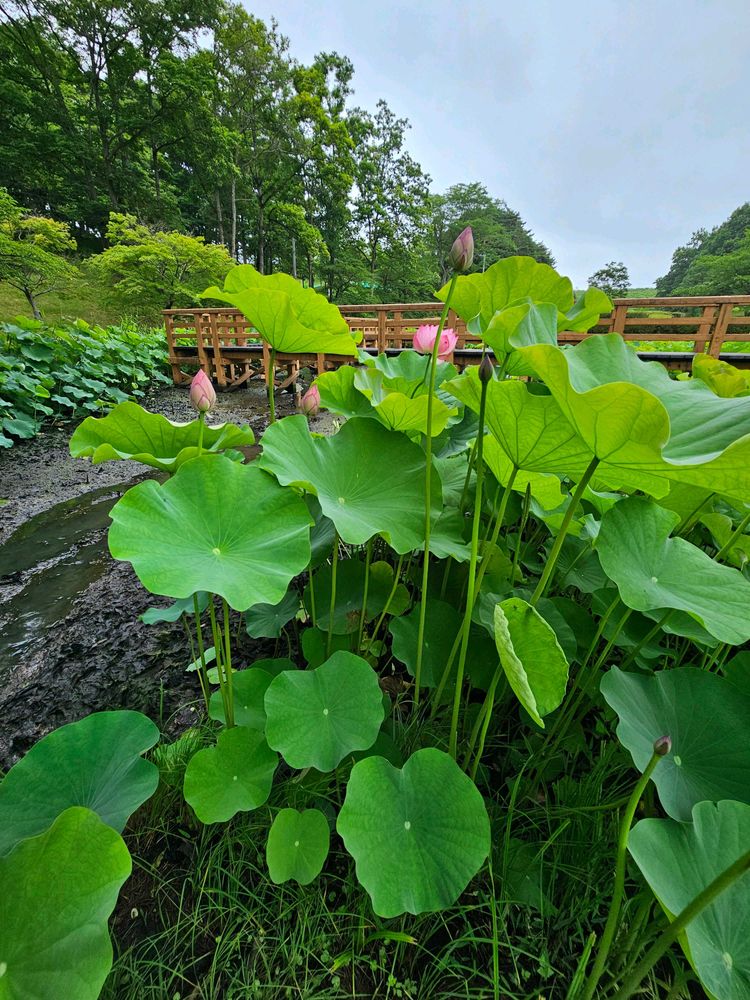 山百合が咲いている所から少し行くと、ハスと睡蓮が咲く池があります。