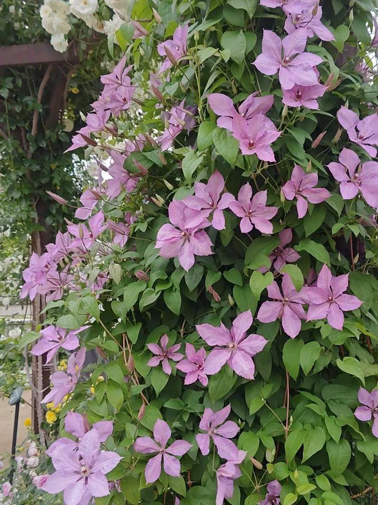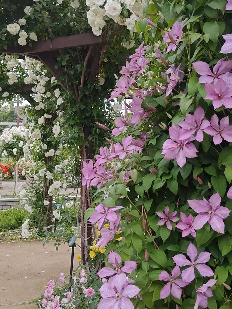 2枚め、3枚め、長居植物園のバラ園、クレマチスとバラの共演&競演。