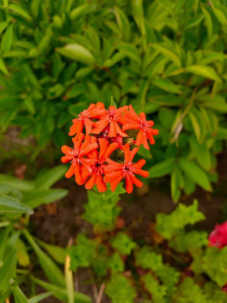 6月から咲いてる朱色の可愛い花がたくさん咲いてます。背丈は50センチくらいで花びらは5枚。葉は小さい物が沢山ついてる。